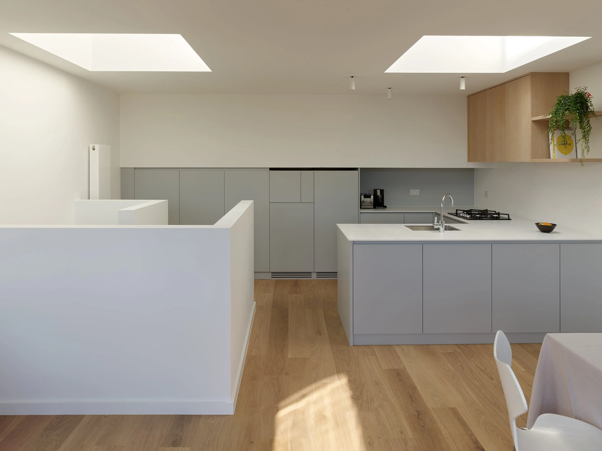 Lower ceiling zones created by the stepped roof profile were treated as part of the overall spatial strategy. These areas were used for storage, plant, and utility functions, allowing the primary living spaces to remain open, light-filled, and flexible. On the top floor, built-in furniture integrates these elements within the kitchen, reducing visual clutter and improving day-to-day usability.